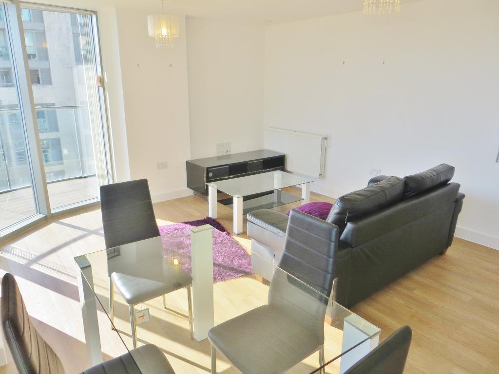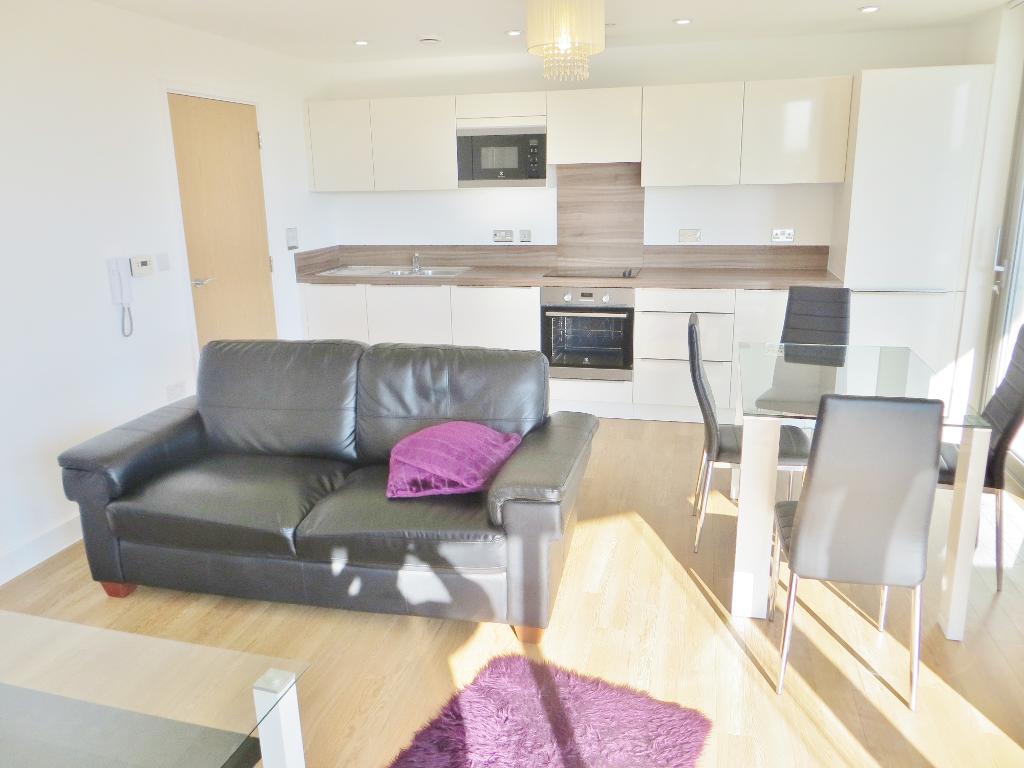 The apartment offers a fantastic view across the city with full length windows, with a fully fitted kitchen and oak effect flooring throughout.